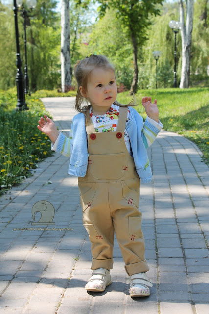 А сегодня показываю бежевый полукомбинезон с красной отделкой. Его Алиса успела примерить до майских праздников.