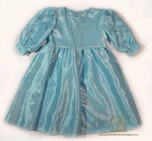 Красивое платье. Очень нежный цвет, цветочки очень украшают рукава. У меня, когда старшая дочка была маленькой, тоже была страсть к пошиву платьев и нарядных и повседневных. А вот сынуля не впечатляется многообразием одежды)))